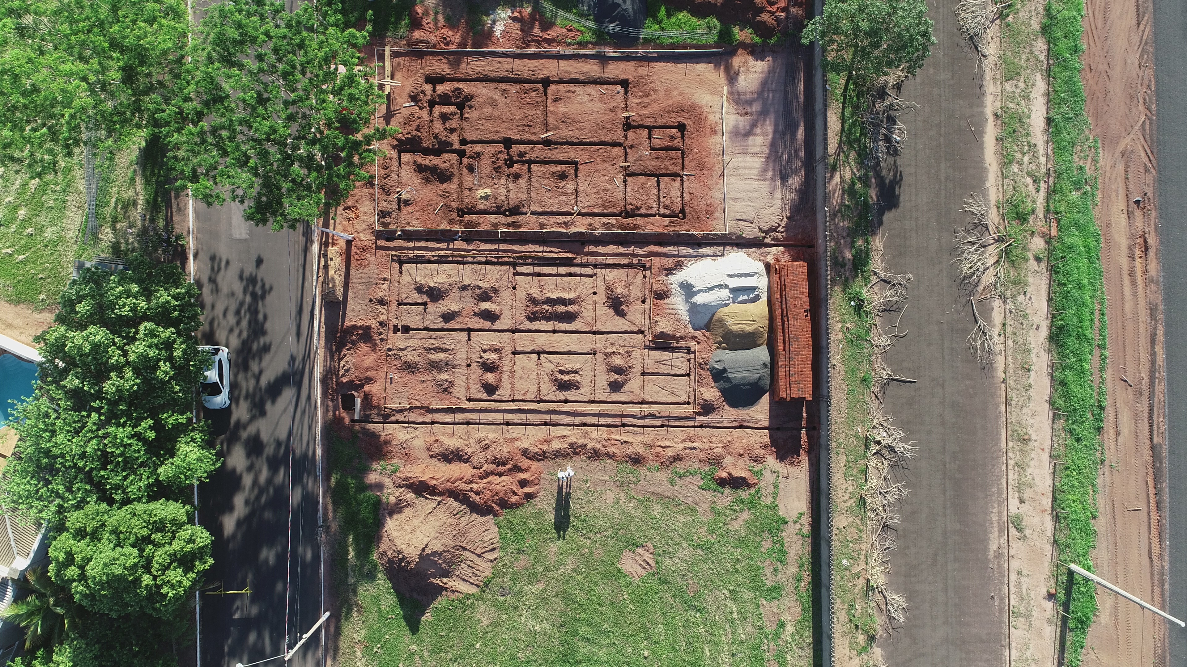 Transferência do projeto ao campo — fundações, eixos, cotas e alinhamentos.
